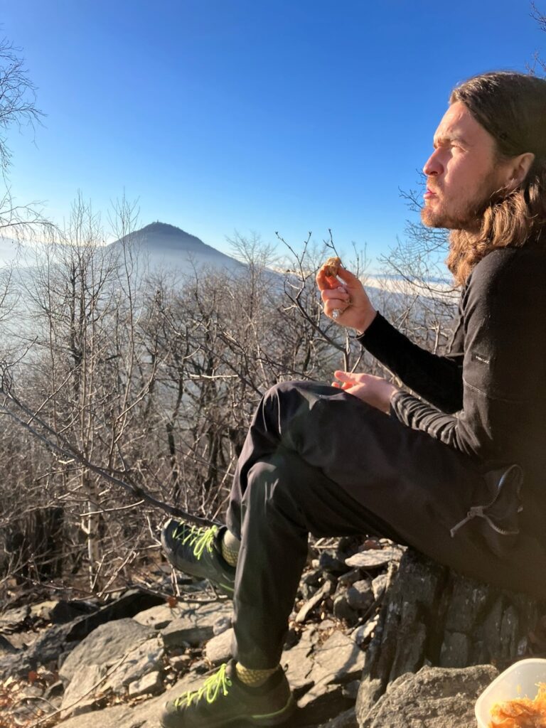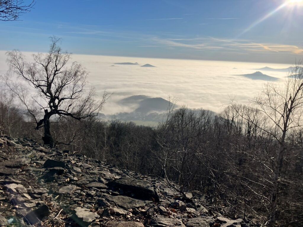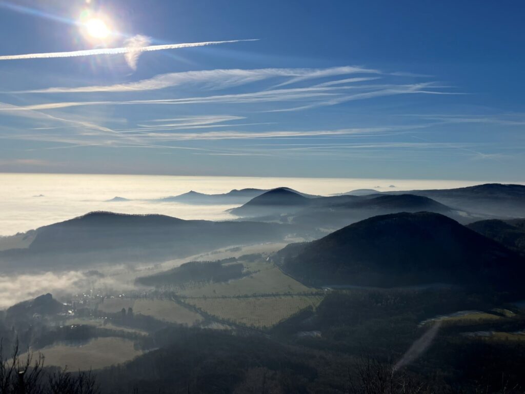 Kombinace touhy spatřit zase slunce, pocitu zimy, co bílá tma přinesla, a snad i sdílená potřeba vyšplhat pryč od tíhy předvánočních dnů nás žene kupředu, a tak se brzy ocitáme nad mraky i na vrcholu. Odměnou za výkon je nám posezení s výhledem na nekonečné české moře. A taky první nohavice štrůdlu.