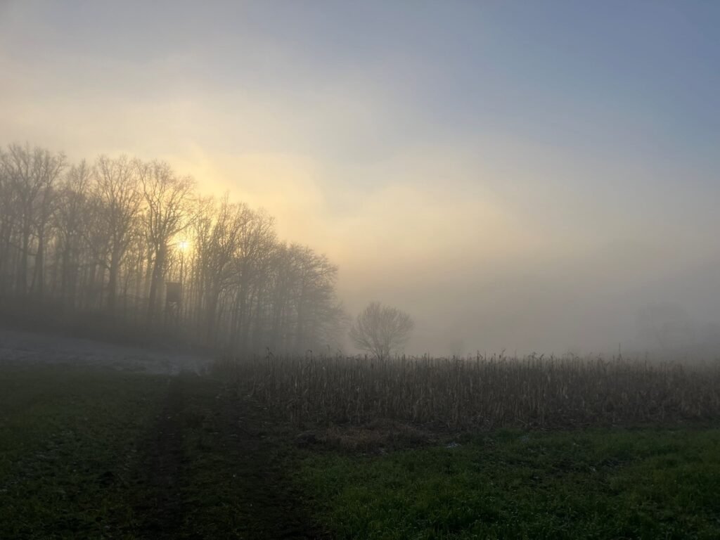 Krátce po 9h je Praha zalitá sluncem a Stopař mě vyzvedává u mě v bažinách. Máme štrůdl, máme chleby, máme čaj a vyrážíme vstříc Českému Středohoří. Stopař má po cestě roupy a hraje si s myšlenkou, zda v týhle kráse nejet přeci jen na to Kokořínsko. To ale chudák zapomněl, že si na výlet vzal Bílou Tmu. Krátce za Prahou nás slunce opouští a my se vrháme vstříc mlžnému oparu. Je jasné, že slunce už dohoníme leda výšlapem vzhůru. A tak se naším cílem stává Milešovka.